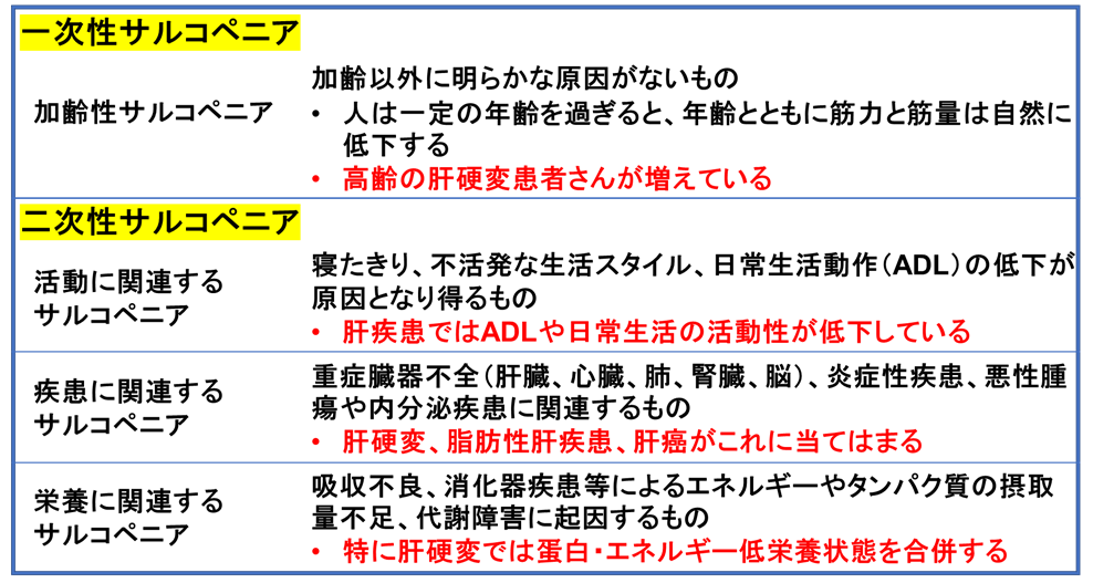 筋肉は「第二の肝臓」と呼ばれ、特に蛋白質の代謝に関わっている。人間は一定の年齢に達すると、加齢に伴い身体機能が低下する。老化に伴い骨格筋における蛋白質の合成と分解のバランスが崩れると、筋肉量の減少や筋力の低下、転倒、歩行障害などが出現し、高齢者の日常生活に負の影響をもたらす。本邦では肝硬変患者の高齢化が進んでおり、年齢(一次性)と疾患(二次性)によるサルコペニアの増加は大きな健康問題になっている。また肥満やメタボリック症候群と関係するNAFLD/NASH患者も増えているが、これらの患者のサルコペニア対策も重要である(表)。