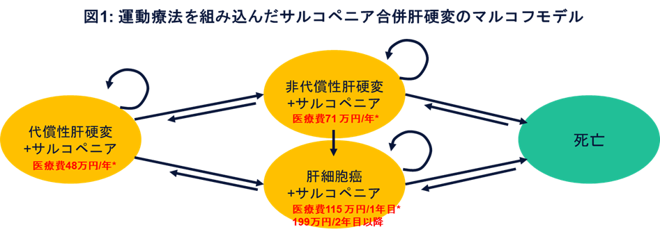 脂肪性肝疾患5、C型肝硬変6、サルコペニア合併肝硬変の患者7を対象として、運動療法の効果別に医療費抑制効果を数理疫学的モデル(マルコフモデル)により検討した(図1)。