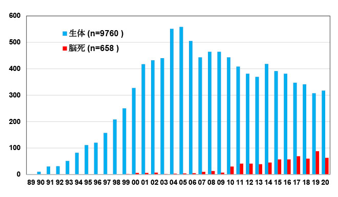2020年12月末までに行われた成人・小児を合わせた肝移植総数は10,418例であり、初回移植10,062例、再移植336例、再々移植19例、再々々移植1例でした(死体移植が各々547例、99例、11例、1例、生体移植が各々9,515例、237例、8例)。ドナー別では、死体移植が658例(脳死移植655例、心停止移植3例)、生体移植が9,760例であり、年間400例程度の肝移植が日本で行われています。図1に、脳死、生体別に2020年末までの本邦での年間移植数の推移を示します。生体肝移植の総数は1989年の開始以降、毎年着実に増加を続け2005年に570例のピークに達した後、2006年に初めて減少に転じ、その後若干増加し2007年以降は400例前後で推移しています。ここ数年、生体肝移植数300例前後に減少しています。一方で、脳死肝移植数は2009年までは年間2〜13例にとどまっていましたが、改正法が年度半ばに施行された2010年に30例と著明に増加し、2015年には初めて年間50例を超えました。さらに2017年に69例と増加、2018年は60例と若干の低下を認めましたが、2019年は88例と過去最多でした。今後の脳死ドナー数の増大が期待されます。なお、脳死肝移植の実施数や登録患者数については公益法人日本臓器移植ネットワークのホームページを参照ください。