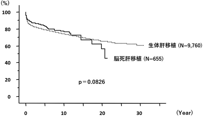 2020年12月末の集計では、国内で死体肝移植を受けた658名(内、脳死肝移植655例)の方々の累積生存率は1年89%、3年86%、5年83%、10年76%、20年56%です。一方、生体肝移植後の累積生存率は、1年86%、3年82%、5年79%、10年74%、20年66%です。脳死移植と生体移植の差はありません(図2:2020年12月末集計)。